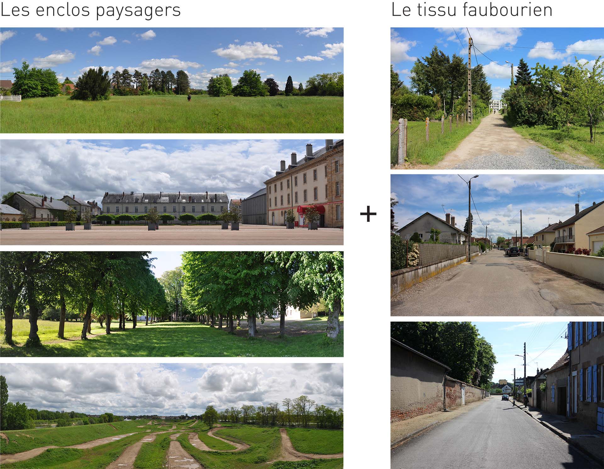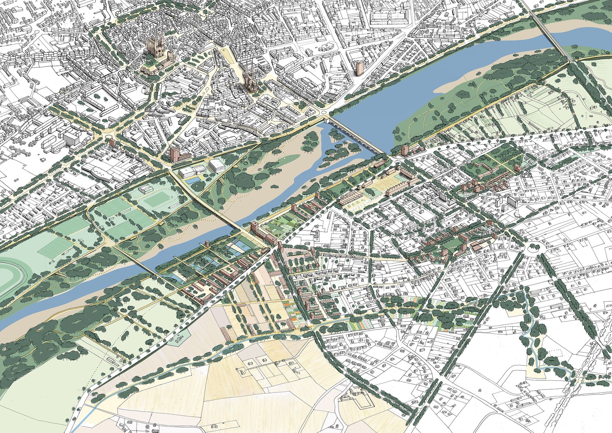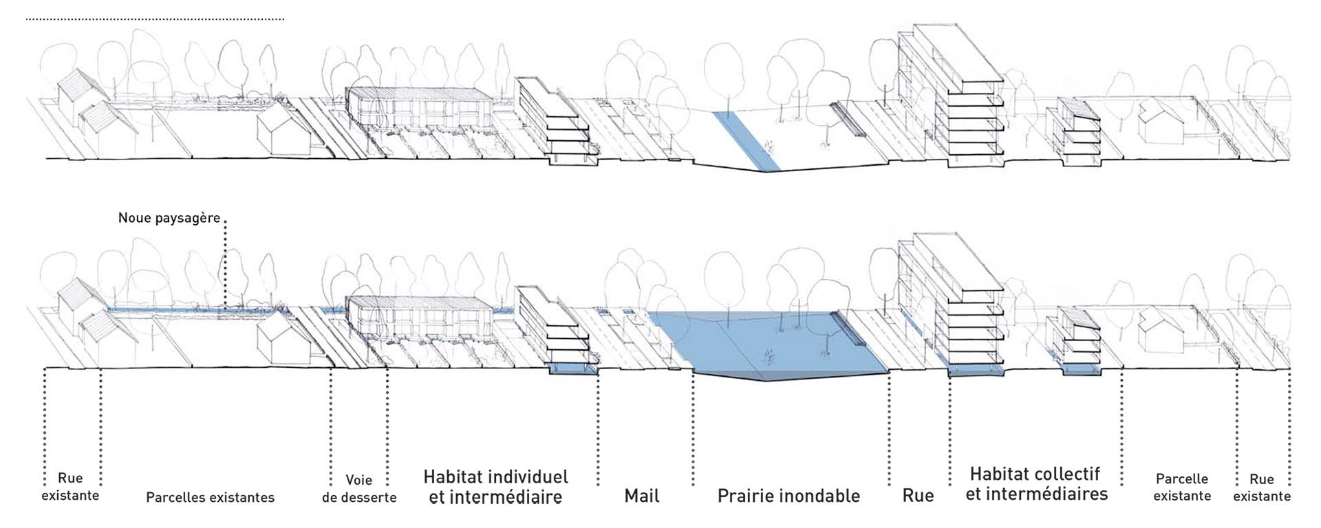 Inclus dans un nouveau maillage de voies cette nouvelle forme urbaine prolonge le parc de l’Allier au cœur du faubourg de la madeleine pour créer une ville jardin. Partie intégrante du système de gestion des crues, le paysage du faubourg évolue en fonction des intempéries. Les prairies, légèrement encaissées par rapport aux voies se transforment en bassins de rétention, avant de libérer leurs eaux par un maillage de noues le long d’axes paysagers en direction de la rivière. La surélévation des rez-de-chaussée au-dessus de parkings semi-enterrés, intègre le même système de retenue d’eau et de transformation du paysage.