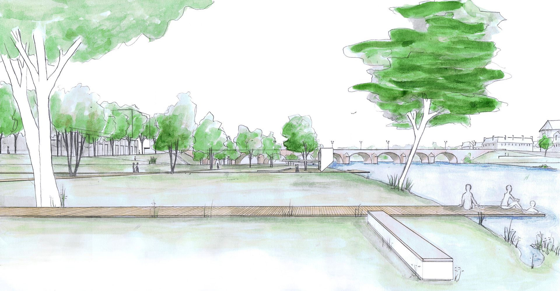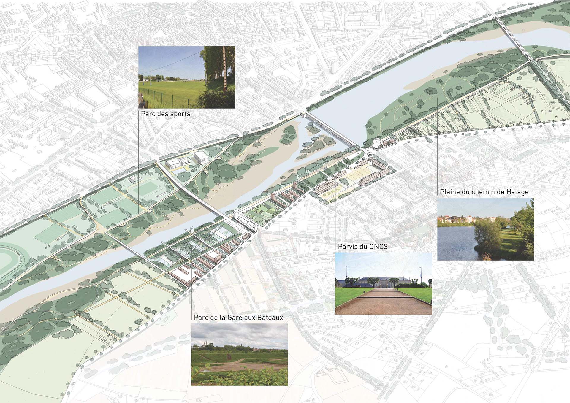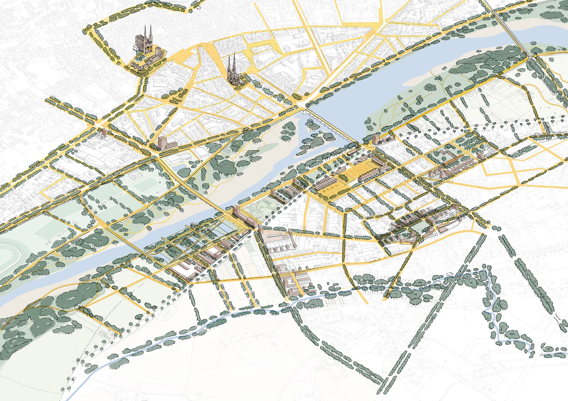 Mettre en relation la ville et sa rivière, c’est retrouver son espace géographique à l’intérieur même du tissu urbain. L’ensemble du faubourg de la Madeleine est pensé comme une extension du parc de l’Allier. Une trame de voies plantées et de mails connectent la rivière aux nouveaux espaces publics en cœur d’îlot.