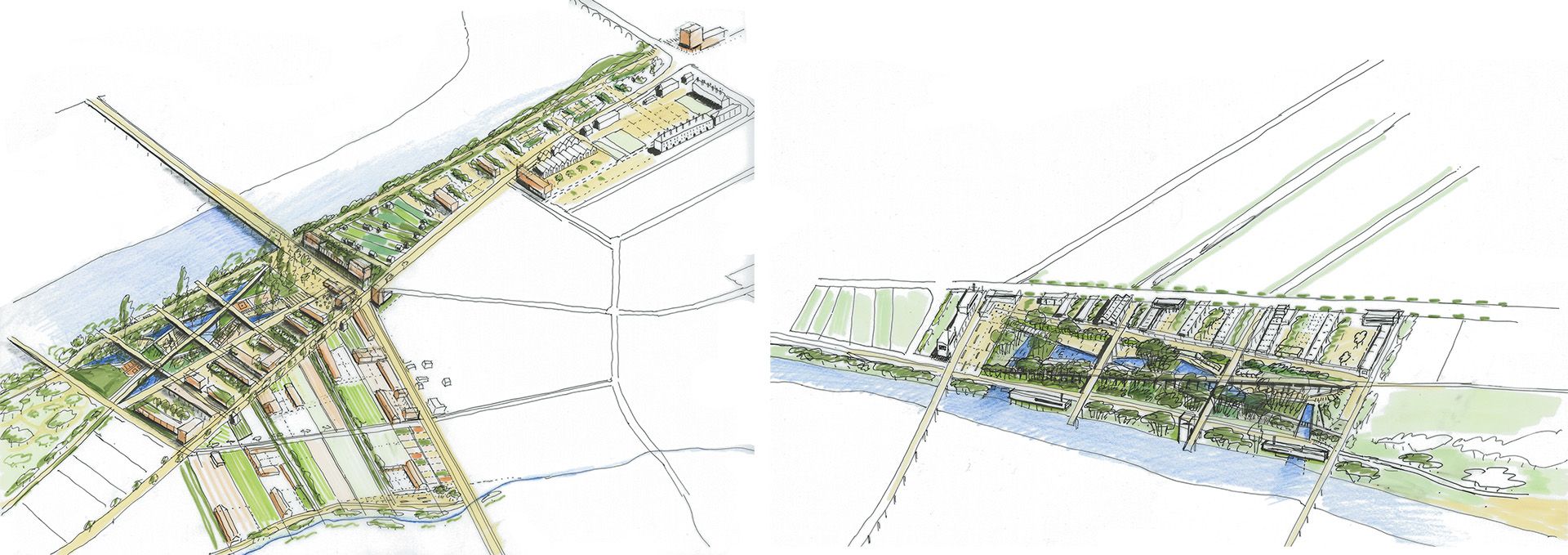Tracée sur l’actuelle digue, la route de Montilly surplombera deux parcs et dégagera de chaque côté un panorama mettant en scène le grand territoire à l’entrée de la ville : A l’Est, le lit de l’Allier et le parc de la Gare aux Bateaux, à l’Ouest, le parc agricole et la campagne à perte de vue. Cet ensemble de parcs, à vocation sociale et économique, sera la vitrine de l’arrière-pays de Moulins.