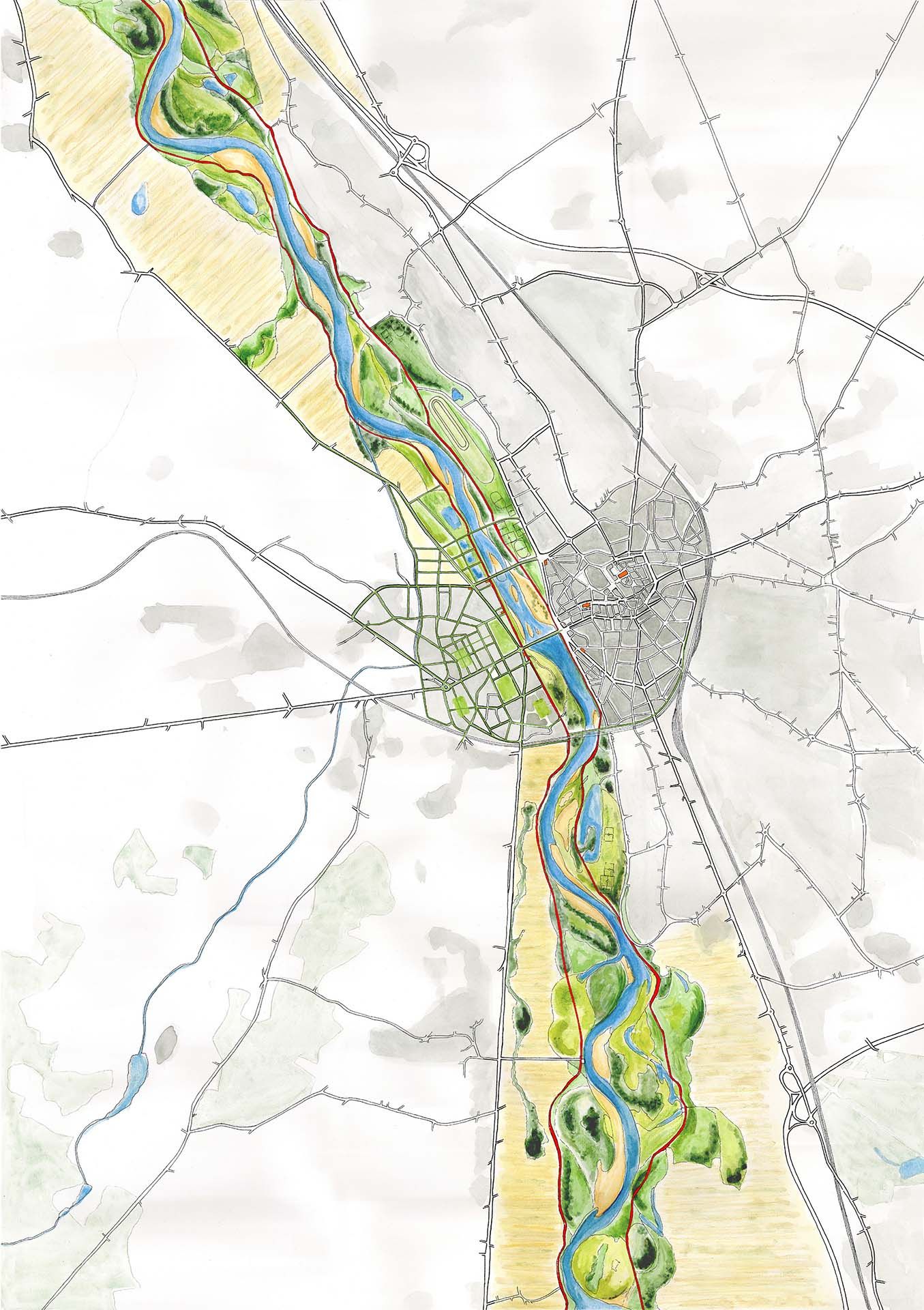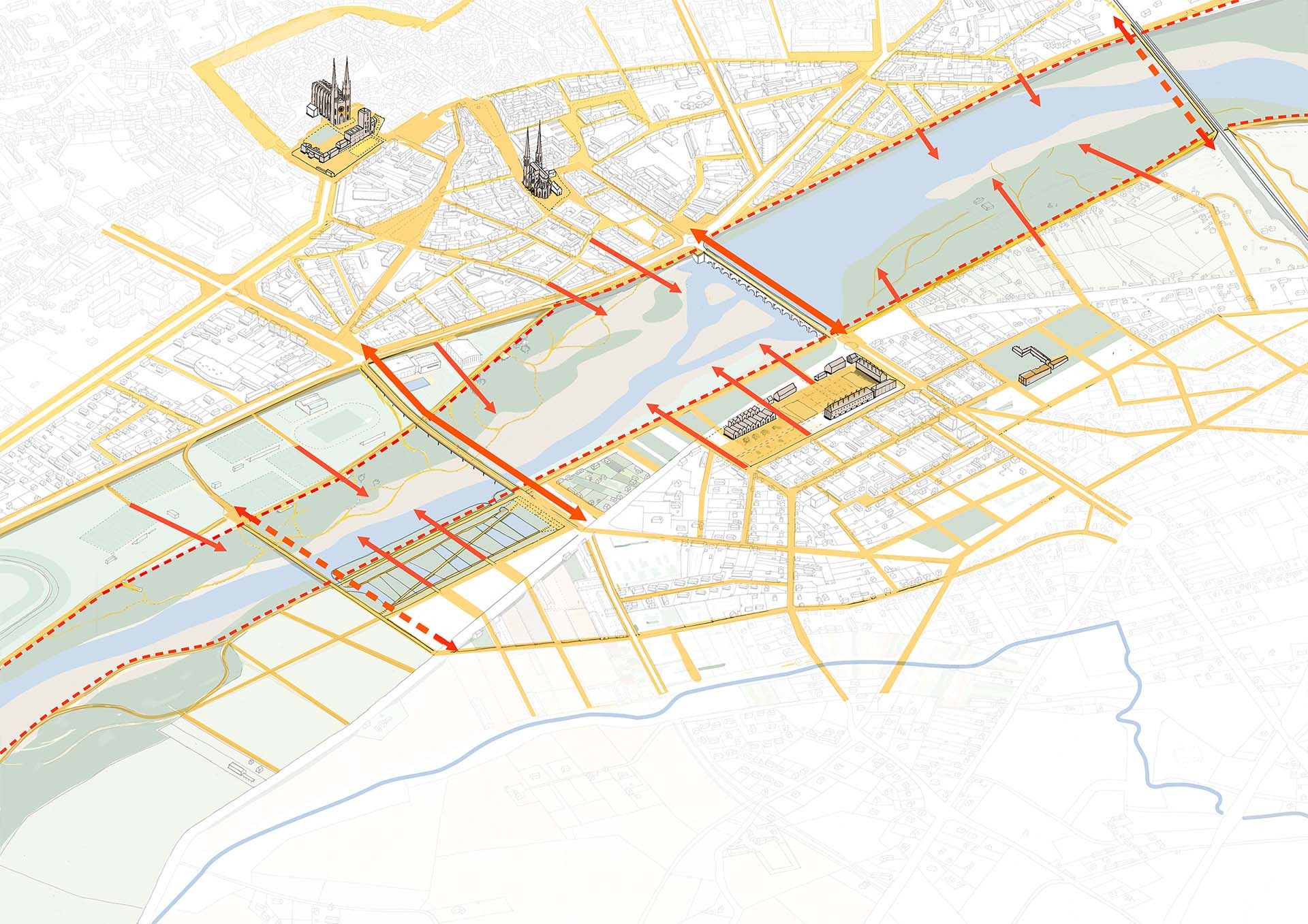 Repenser la relation de la ville avec sa rivière, c’est inscrire la ville dans son territoire. Partant du cœur de la ville de Moulins, le projet connecte le grand parc départemental du Val d’Allier, reliant ainsi par les différents espaces naturels du lit de la rivière les villes qui l’environnent. De nouveaux itinéraires piétons et cyclistes, de part et d’autre du cours d’eau, forment un vaste réseau parcourant les plages, les plaines inondables, les sous-bois et les champs, participant du nouveau système urbain.