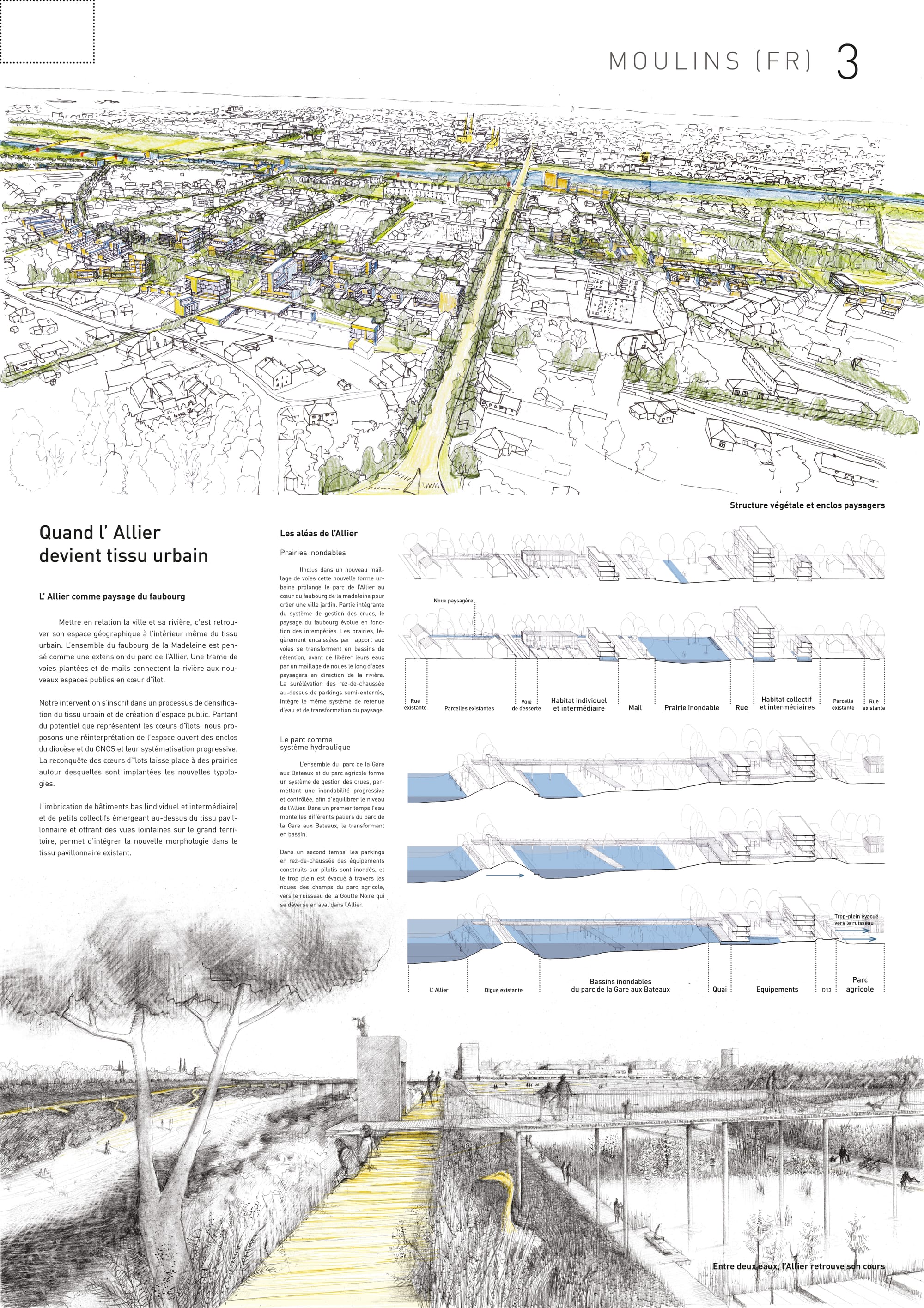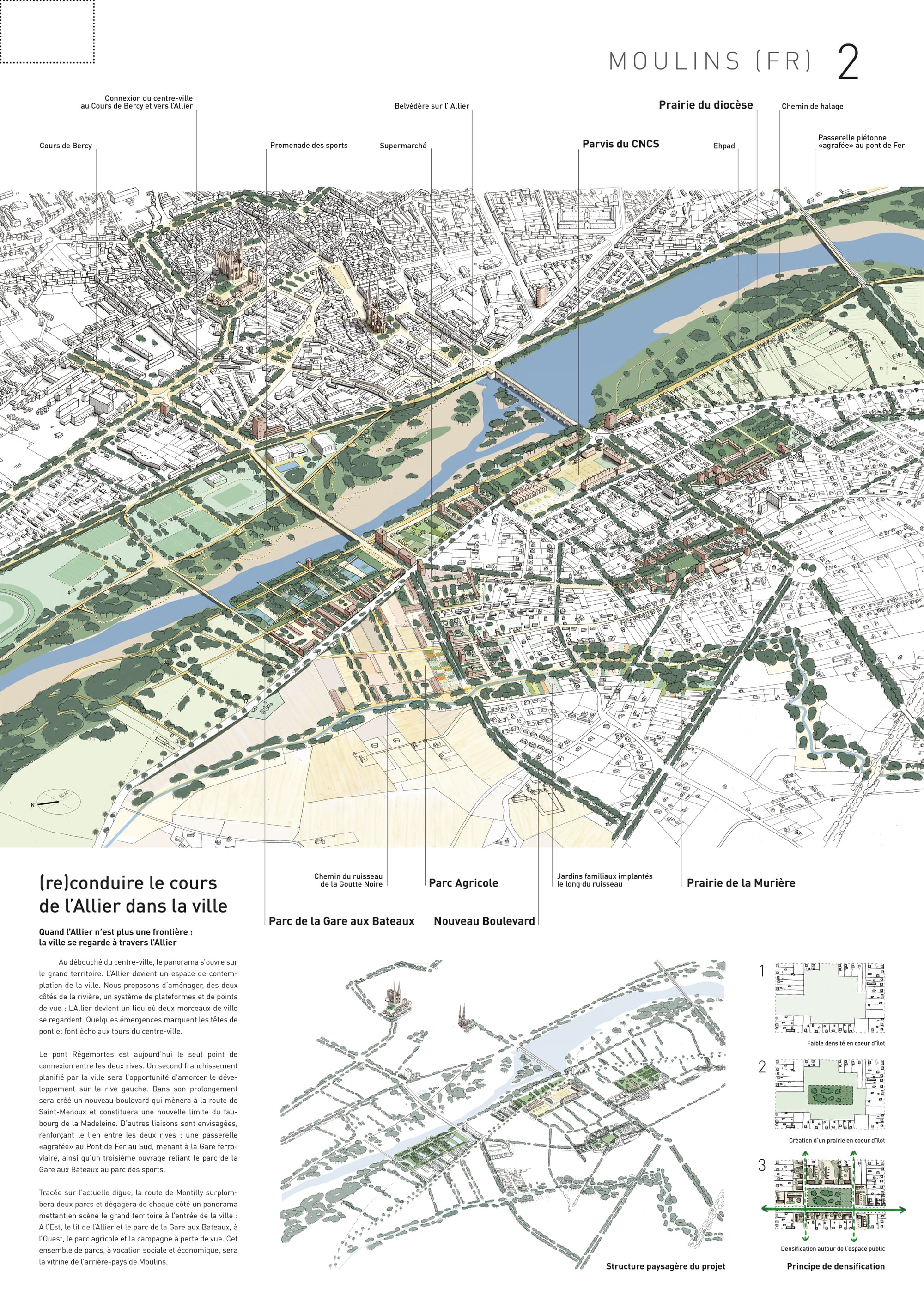 L'équipe considère la ville de Moulins comme un point d’inflexion dans le parc départemental de la vallée de l’Allier. L’épaisseur du lit majeur dessine un espace ouvert de contemplation à mettre en scène en développant des points de vue et belvédères, des pontons et espaces de déambulation, des émergences architecturales répondant aux flèches des édifices religieux de la rive droite. Sur le plan urbain, le projet s’appuie sur un réseau de cheminements et une trame d’espaces publics interconnectés entre les deux rives. En continuité du nouveau pont se développe un nouveau boulevard délimitant le faubourg de la Madeleine. La création de plusieurs parcs submersibles en vis-à-vis a pour but de maximiser l’accessibilité aux berges et de développer les usages au contact de l’eau. Le site de la Murière fait l’objet d’une densification progressive par ses limites en continuité du tissu existant. Le projet privilégie des formes urbaines plus denses sur la rive gauche.