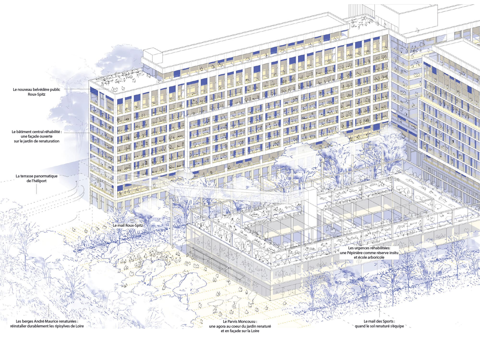 La mutation du site de l’hôpital s’opère par l’exploration de plusieurs axes programmatiques, s’inscrivant en partie dans la continuité de l’occupation existante.
