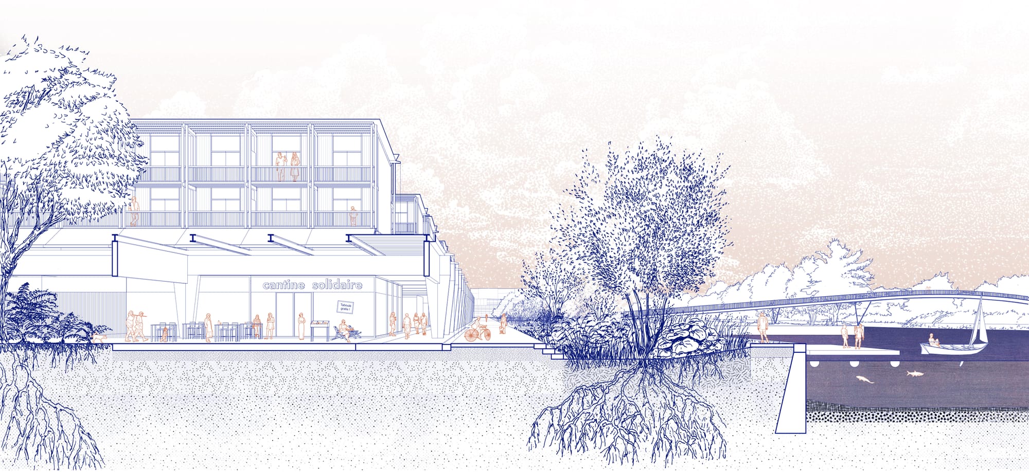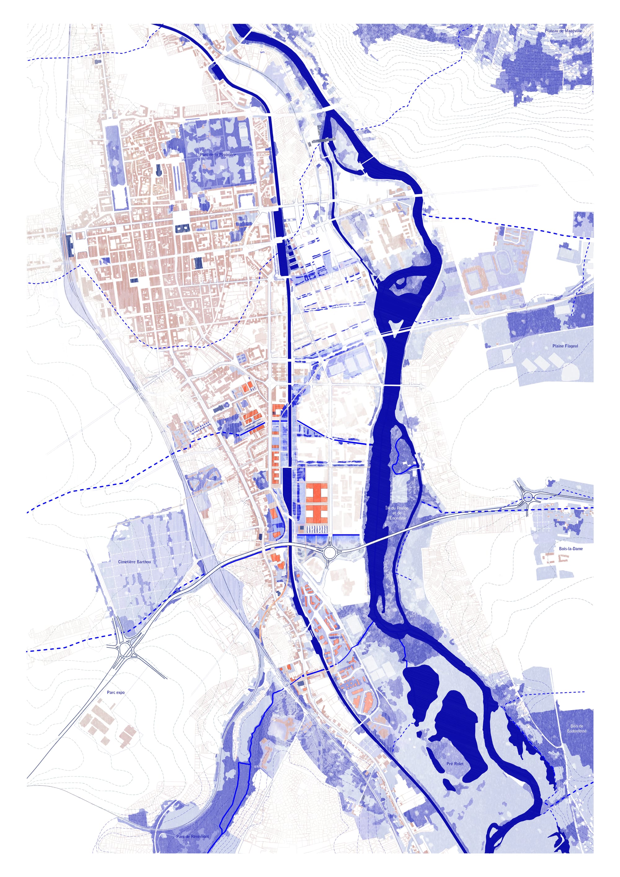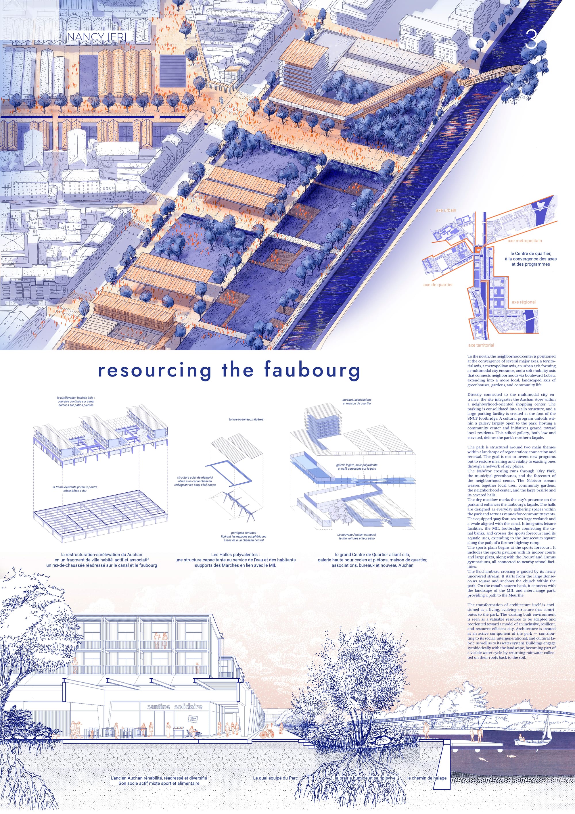 Le projet s'inscrit dans une ambition territoriale vaste : celle d’un Grand Parc Canal-Meurthe, une figure paysagère capable de réancrer la ville dans sa géographie. En prolongeant les dynamiques métropolitaines initiées dans les années 90 par Alexandre Chemetoff, notre intervention se veut le trait d'union entre l'héritage urbain et les nouveaux enjeux climatiques. Ici, l’enjeu n'est pas de faire table rase, mais de faire coexister les modes d'habiter existants. Nous concevons le site comme une « table » de rencontre, un espace de liens où les infrastructures et le vivant s'articulent pour dessiner une urbanité partagée et apaisée.