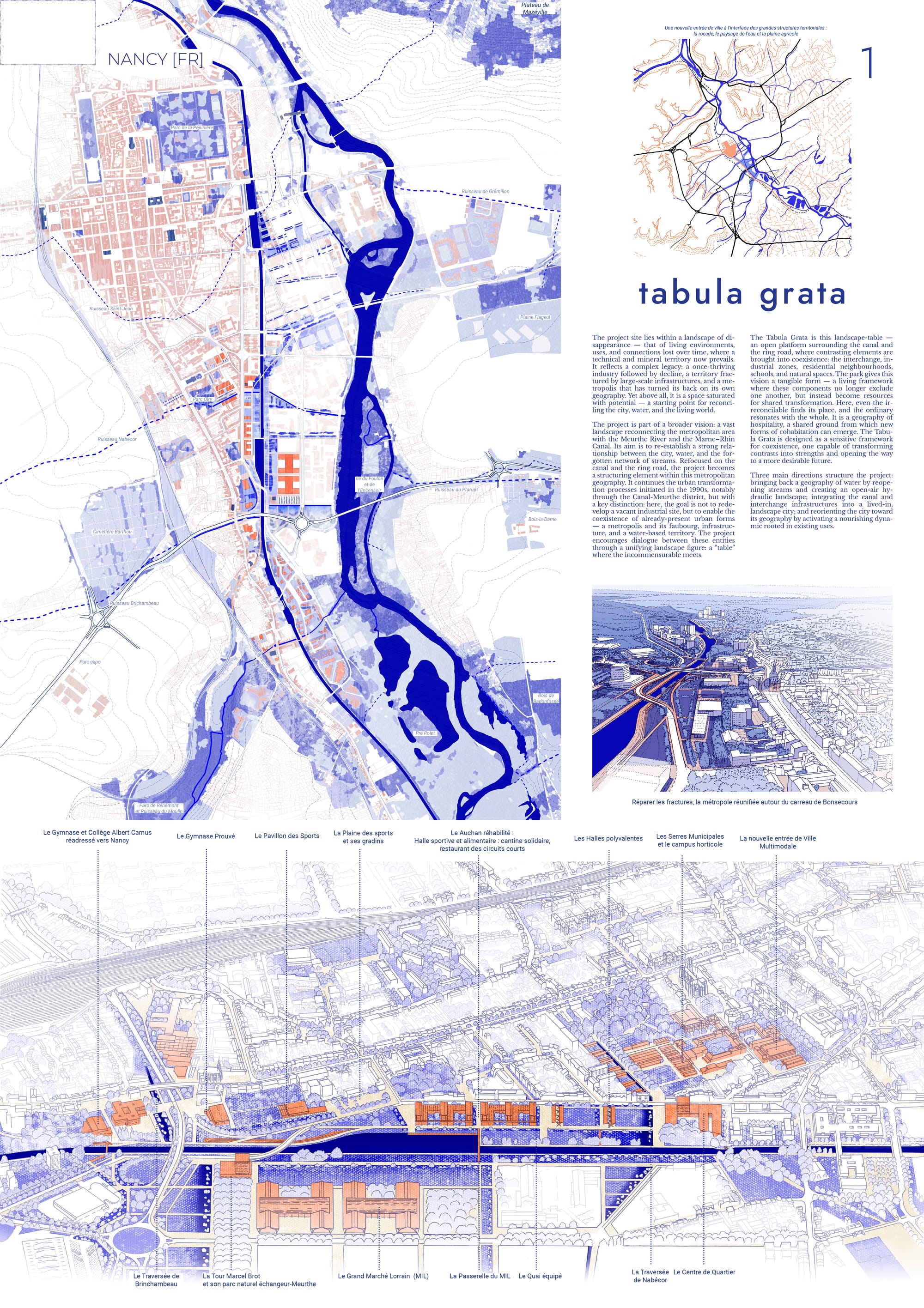 À la croisée de la M674 et du canal de la Marne au Rhin, entre Nancy et Jarville-la-Malgrange, ce site porte les strates d'une histoire complexe. Des premiers faubourgs nés au fil de l’eau à l’essor industriel marqué par le rail et le canal, jusqu'à la déprise contemporaine, le territoire témoigne des mutations de la vallée de la Meurthe. Aujourd'hui fragmenté par le tout-voiture, ce paysage anthropisé appelle un nouveau souffle. Plutôt que d'y voir une fatalité, nous y lisons un espace saturé de possibilités, un terrain où faire dialoguer l’incommensurable. Nous proposons, à travers ce projet, de transformer ce socle minéral en un levier de réconciliation globale, en restaurant les cycles du vivant et en redonnant à l’eau sa place légitime au cœur d’une métropole reconnectée à sa géographie.