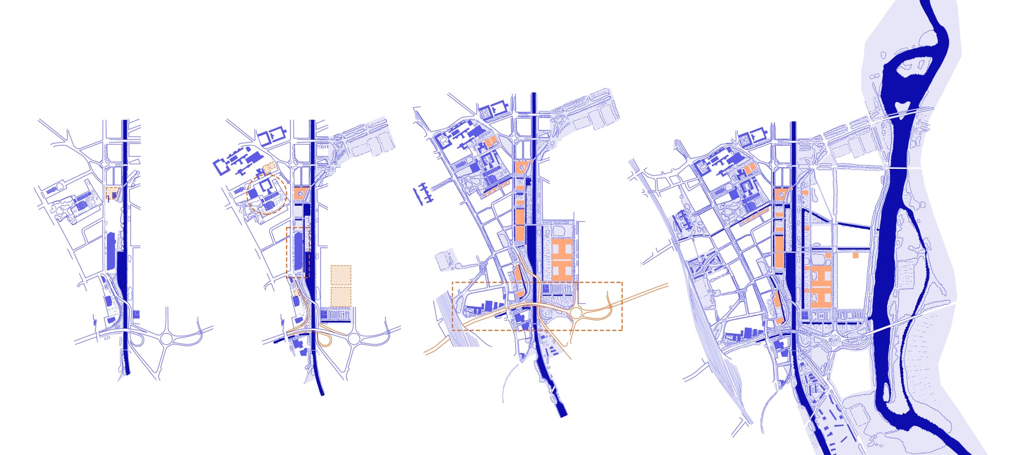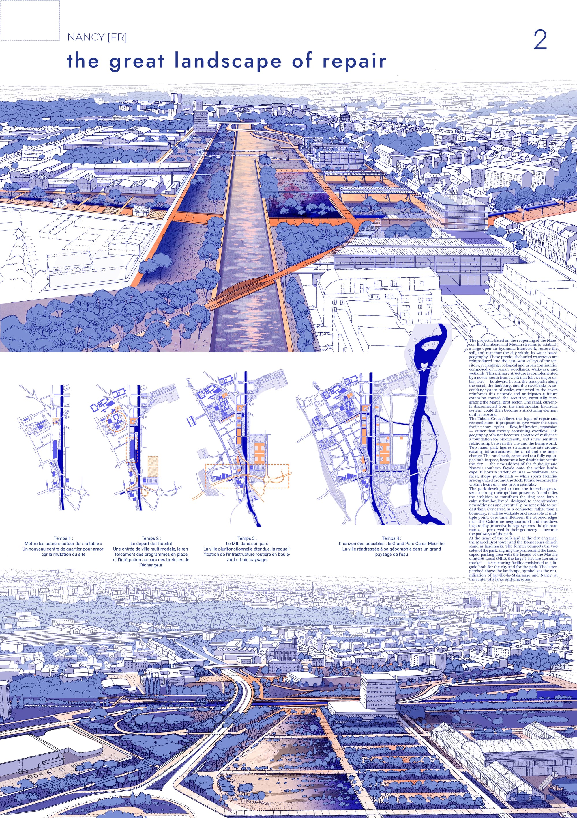- La géographie retrouvée (Temps 4) : Le projet culmine par l'extension conjointe du parc et de la ville jusqu'à la Meurthe. La renaturation globale devient le levier du renouvellement des emprises industrielles, installant un paysage capable d'accueillir de nouveaux usages. De la voie ferrée jusqu'aux berges de la rivière, cette continuité géographique scelle la réconciliation définitive entre la métropole et sa géographie.